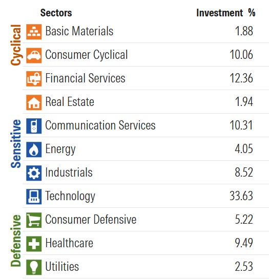 The other thing to consider is that when a sector has outperformed as significantly and for as long as technology has (up close to 600% over the past decade and +900% over the past fifteen years), portfolios tend to become very overweight that sector. This is true because of portfolios’ exposure to the overall market (e.g., passive exposure to the S&P 500), but also when they are invested in things like private assets because the majority of venture, growth equity, and even buyouts and private credit investments are significantly allocated to the technology sector.