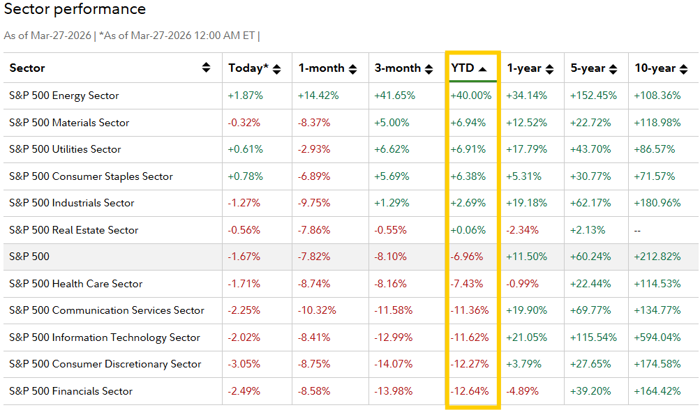 What if I told you that the difference between the best and worst performing sectors through the end of March is more than 50%???